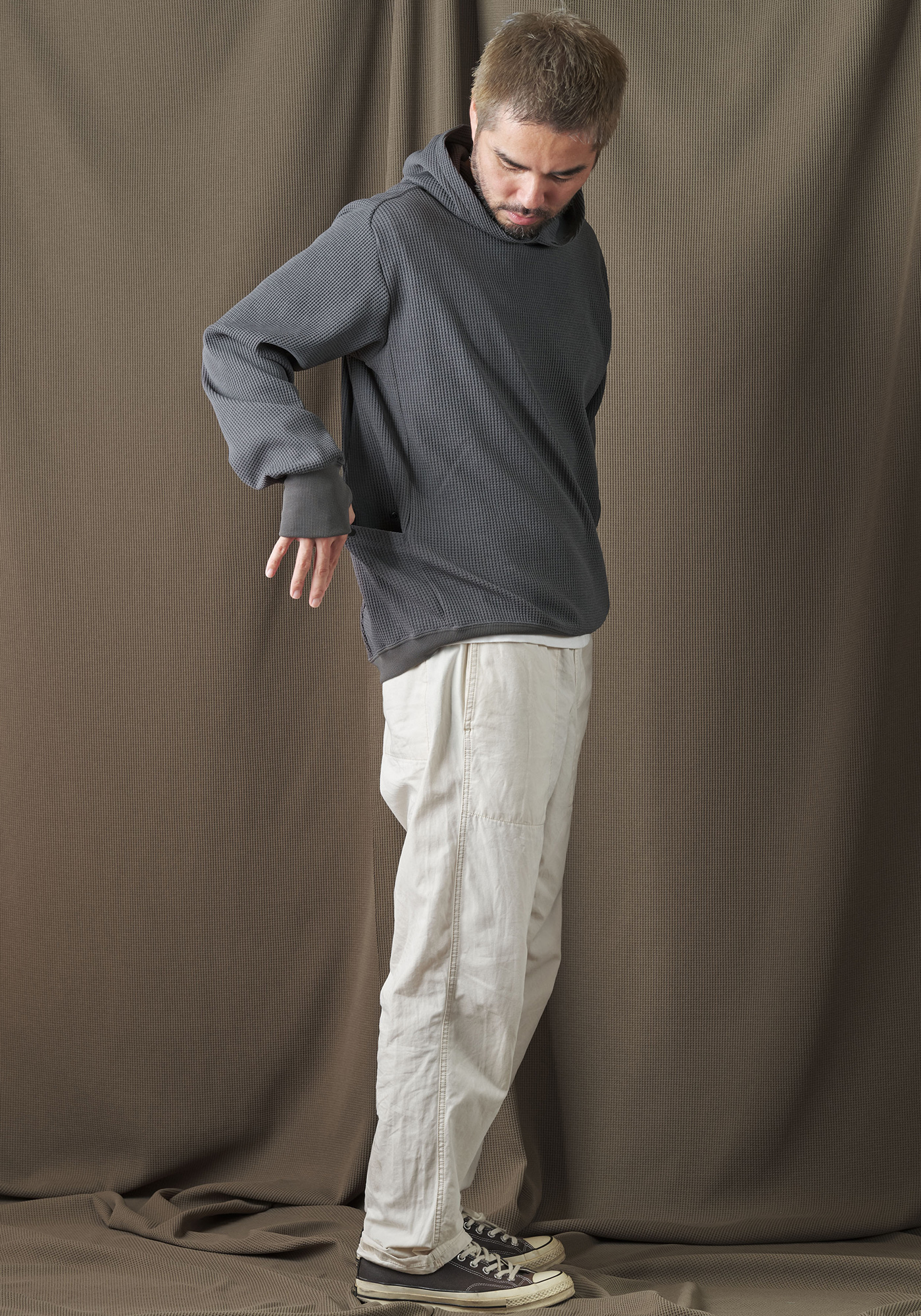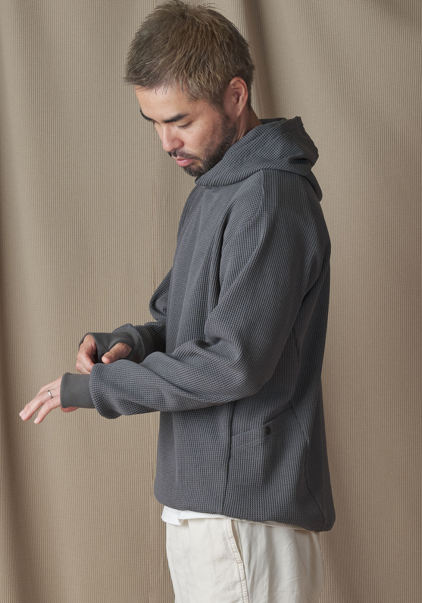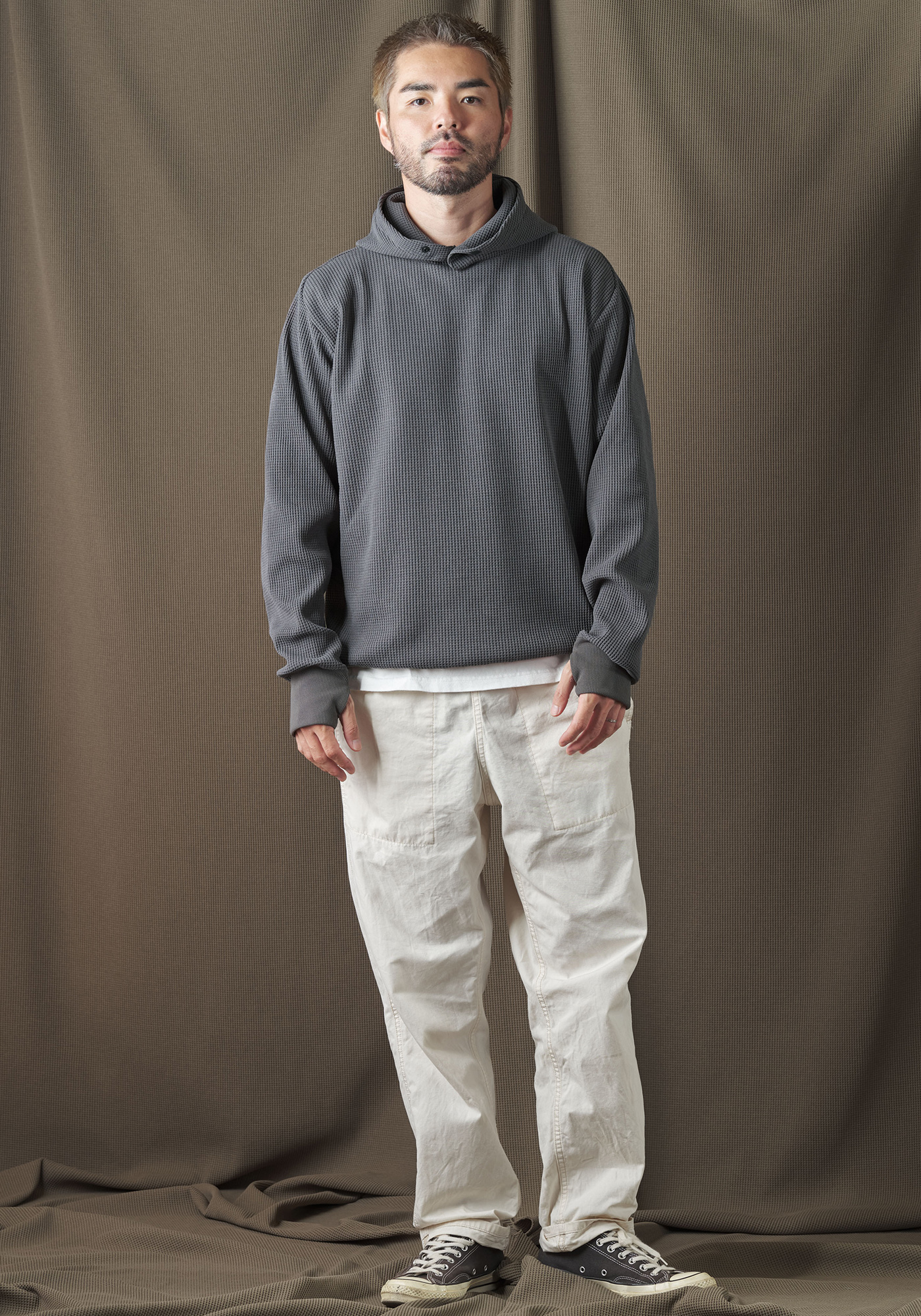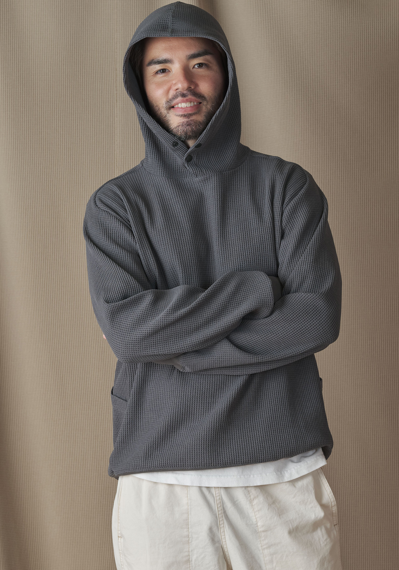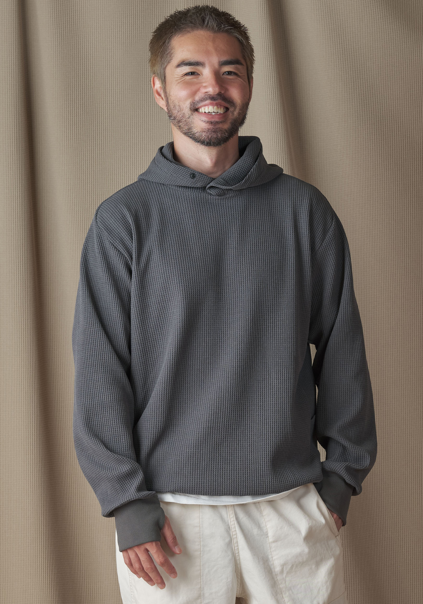 普段のサイズでジャストサイズ。程よい生地の厚みなので、1枚でもレイヤードにもピッタリ。首元のスナップボタンのおかげでフーディーにありがちの首元に入る風を防いでくれるのは肌寒い時期に便利なディテールです。袖はライディングを考えて長めになっています。