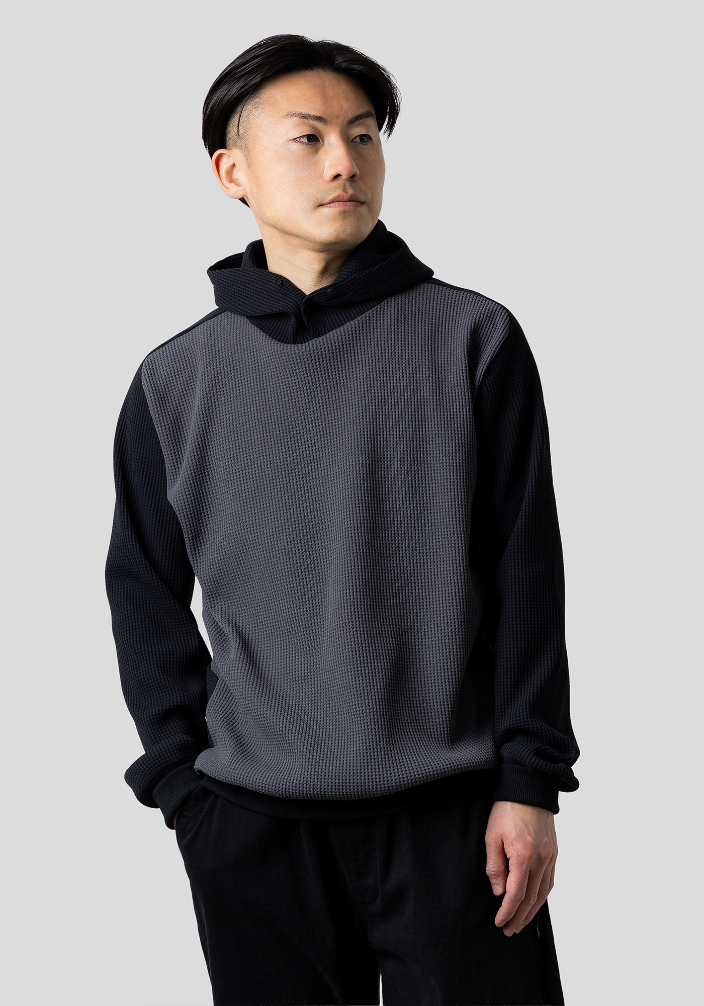普段のサイズでジャストサイズ。程よい生地の厚みなので、1枚でもレイヤードにもピッタリ。首元のスナップボタンのおかげでフーディーにありがちの首元に入る風を防いでくれるのは肌寒い時期に便利なディテールです。袖はライディングを考えて長めになっています。