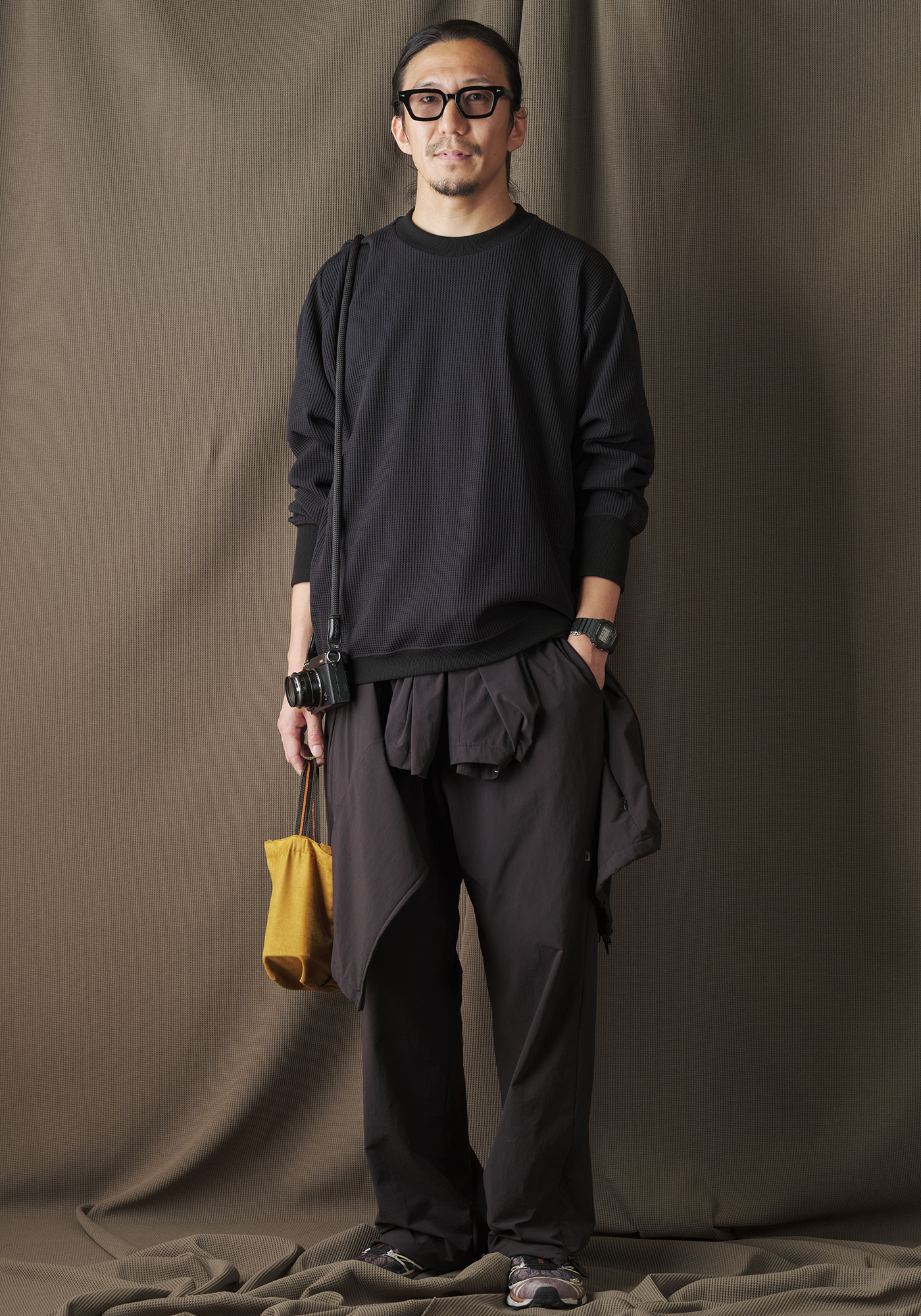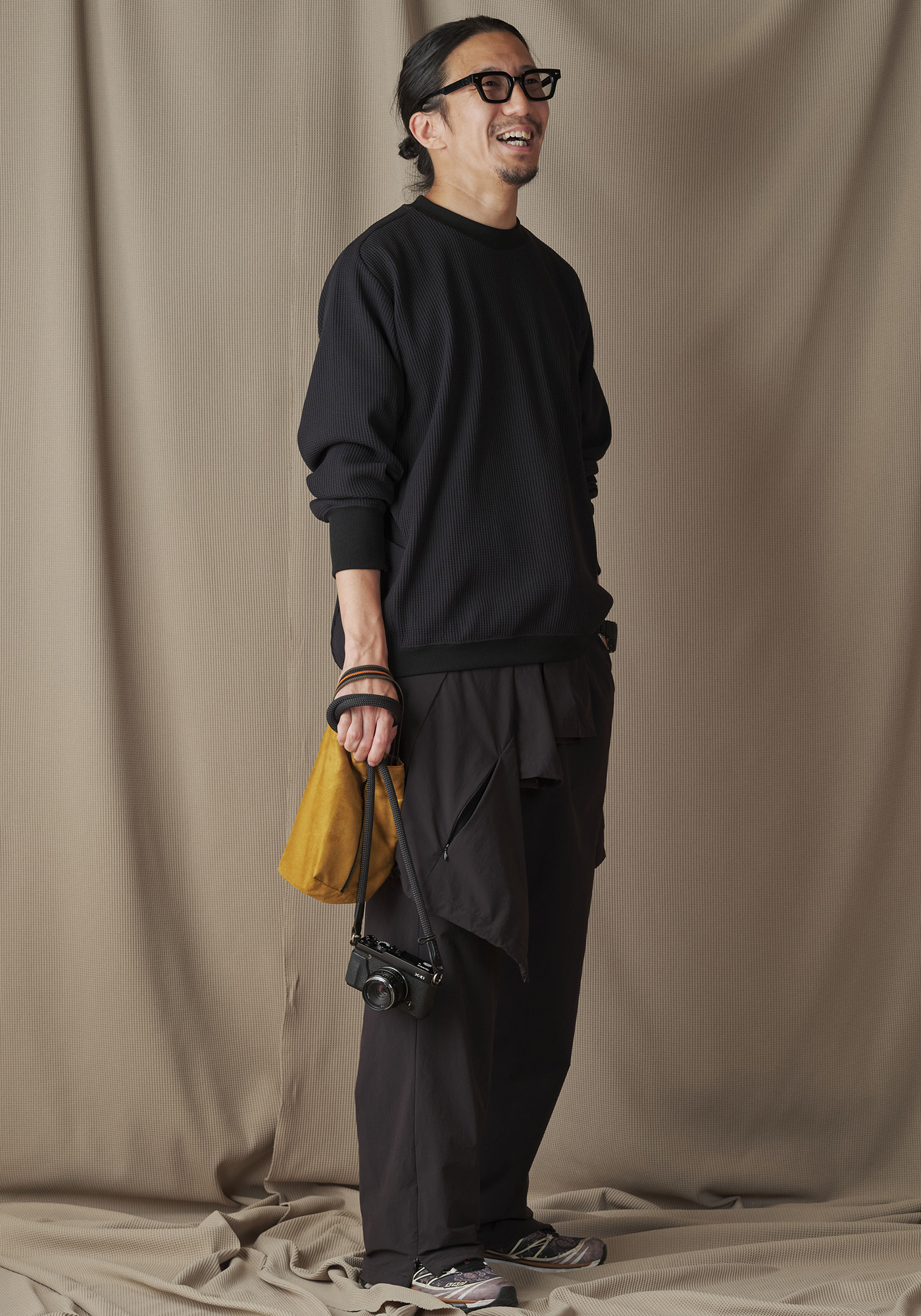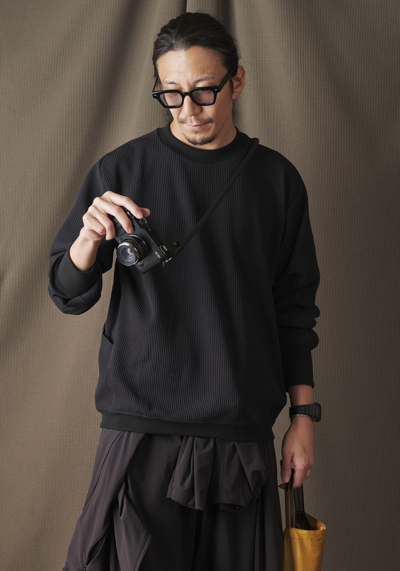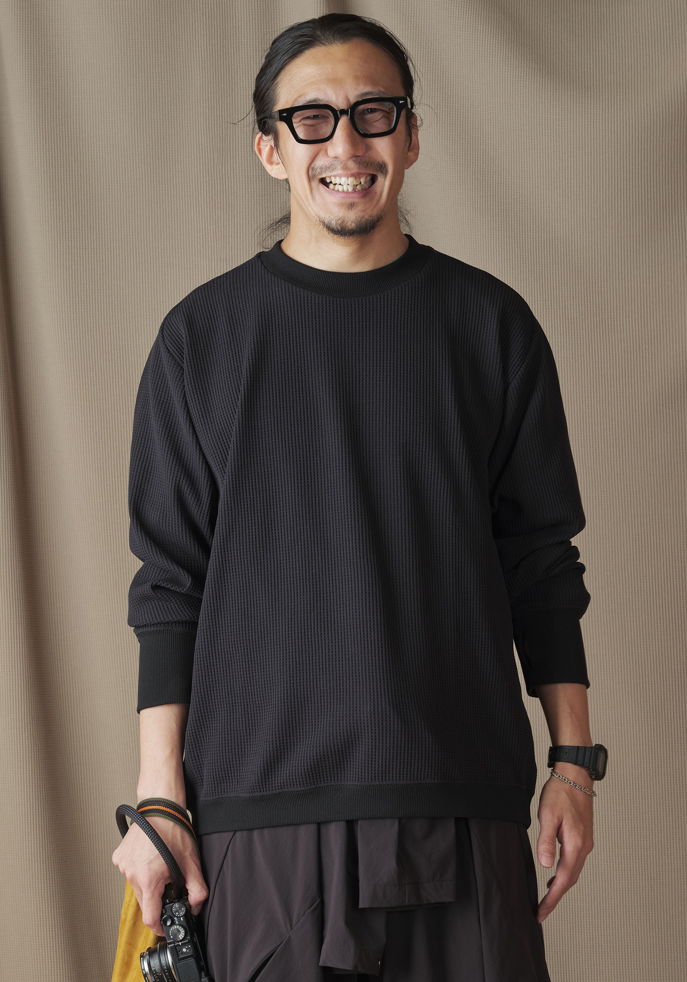 涼しく軽いので快適な着心地のワッフル生地のスウェット。ジャスト目のサイズ感なので、ゆったり着たい方はサイズアップを。