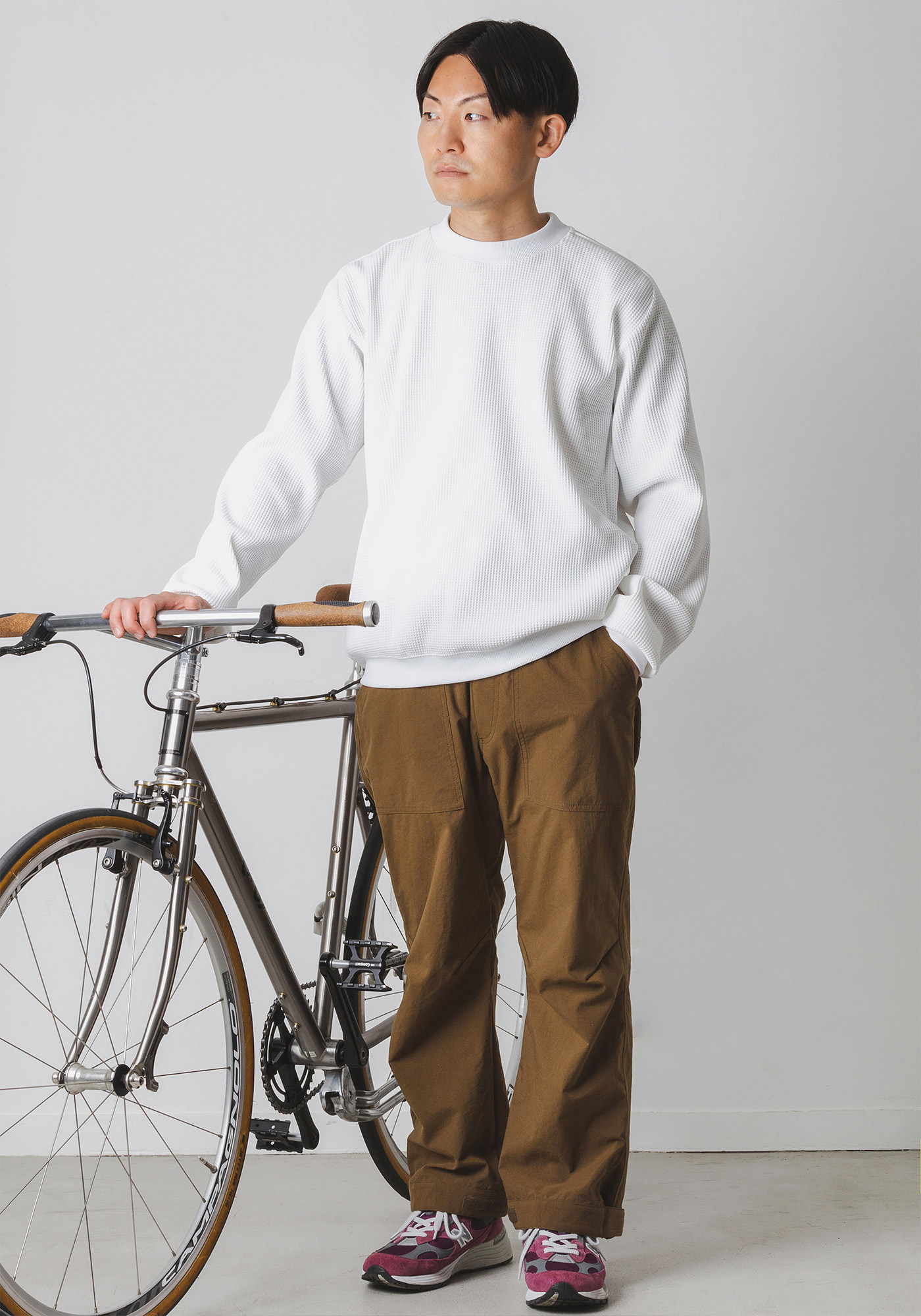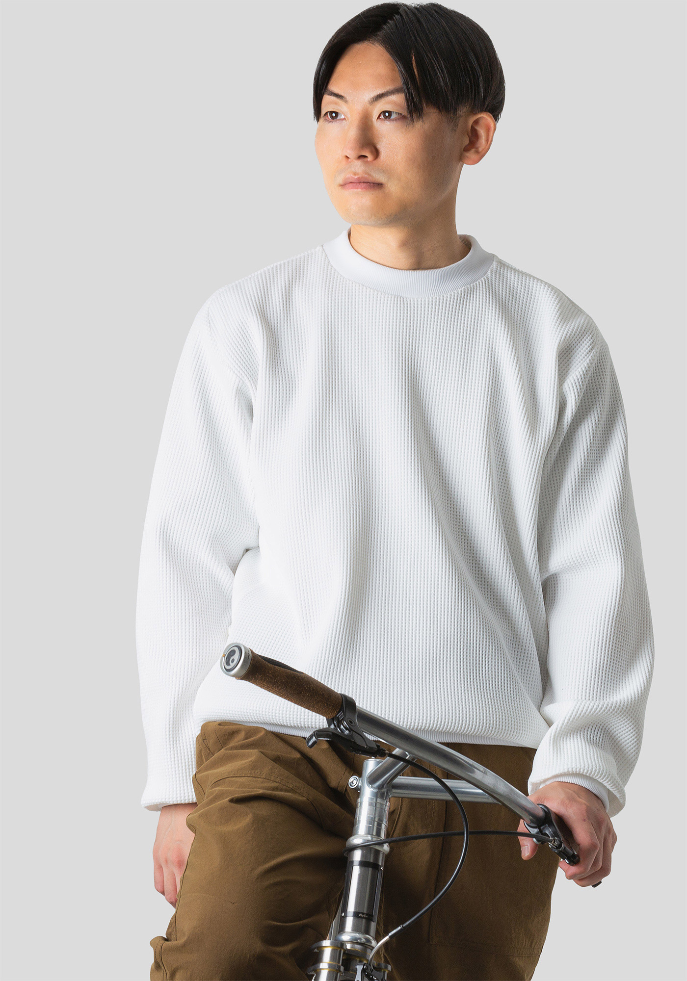 涼しく軽いので快適な着心地のワッフル生地のスウェット。ジャスト目のサイズ感なので、ゆったり着たい方はサイズアップを。