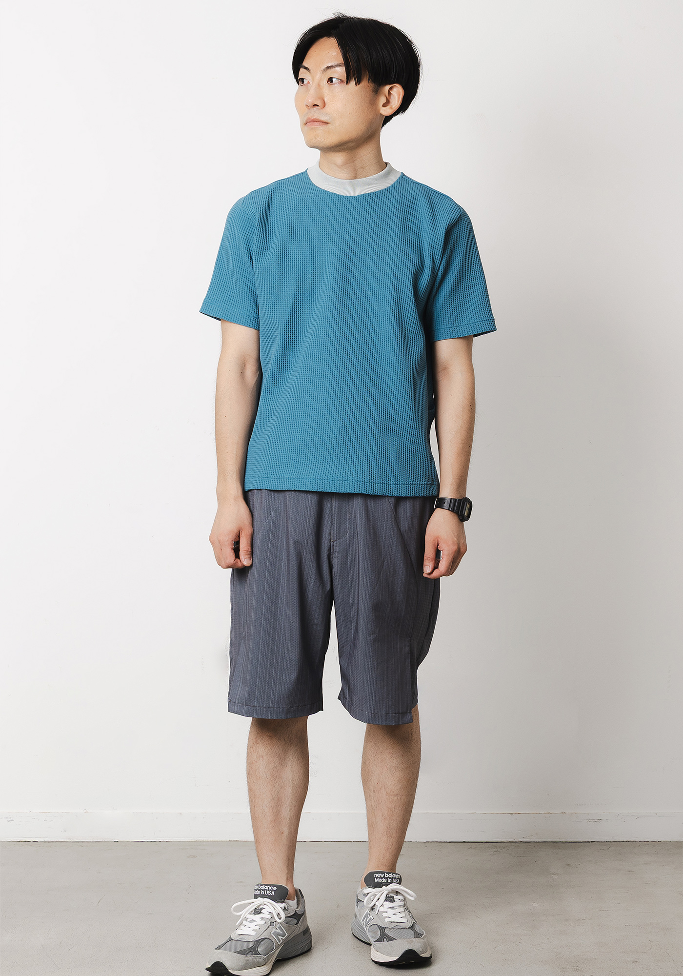 凹凸のあるワッフル組織により無地ながら存在感のある雰囲気に仕上がっており、一般的なTシャツと差別化を図っています。