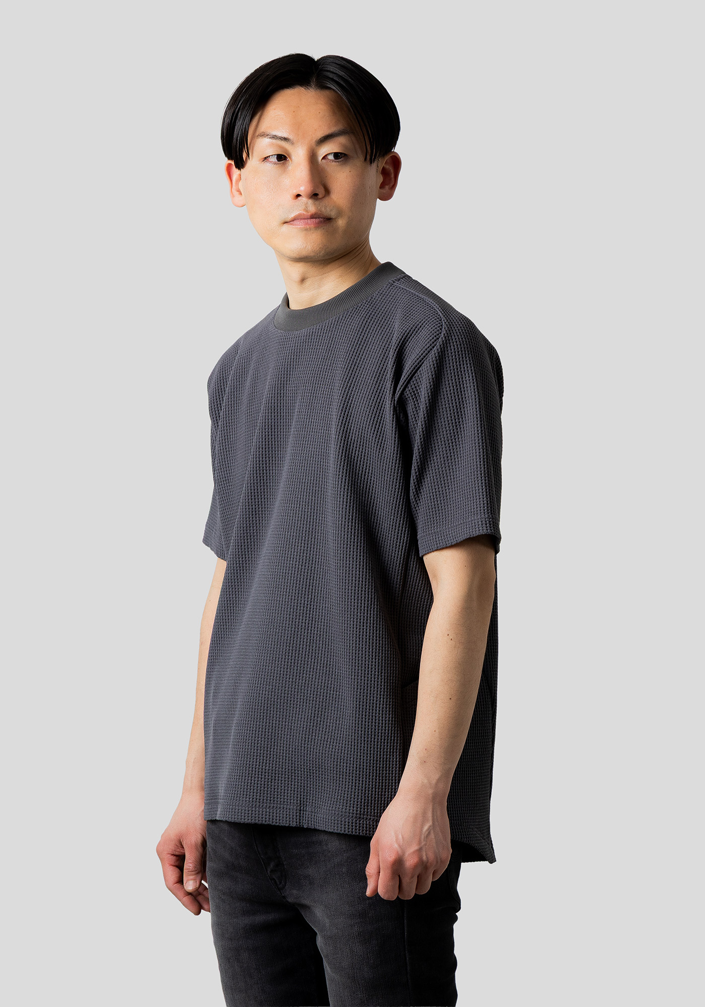 凹凸のあるワッフル組織により無地ながら存在感のある雰囲気に仕上がっており、一般的なTシャツと差別化を図っています。