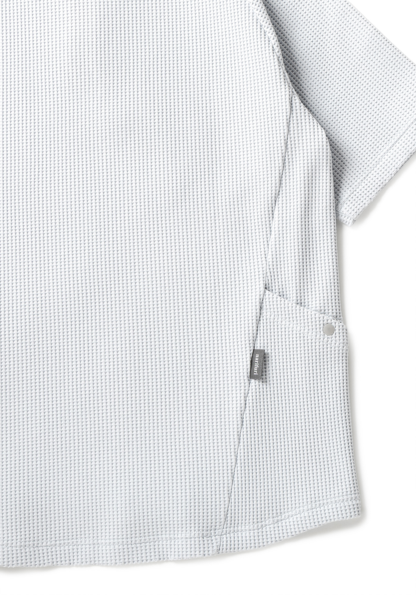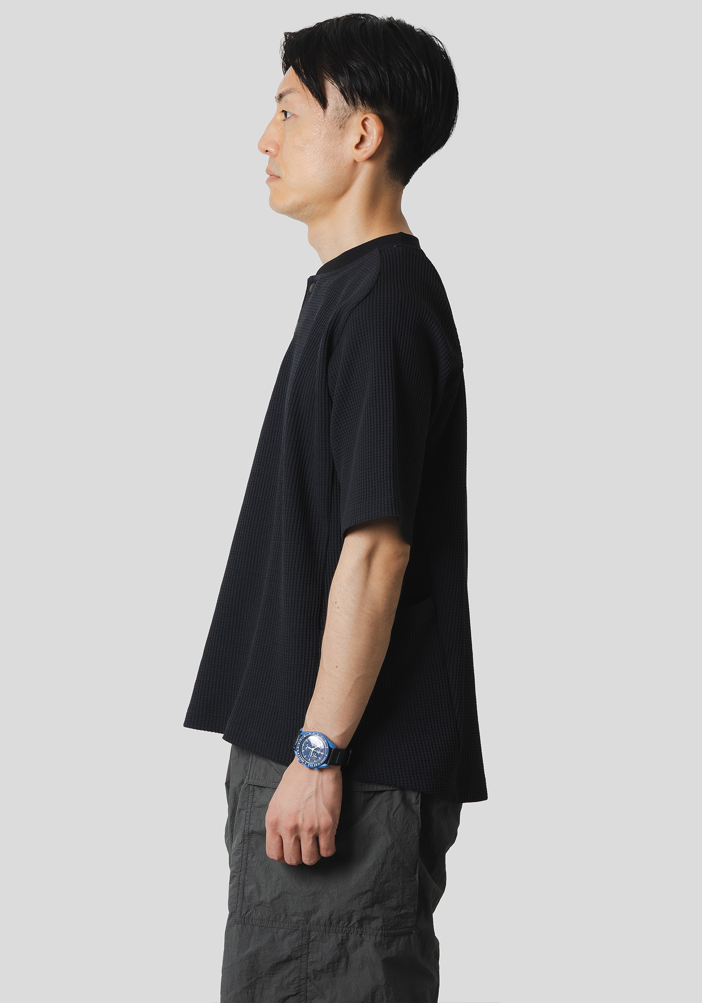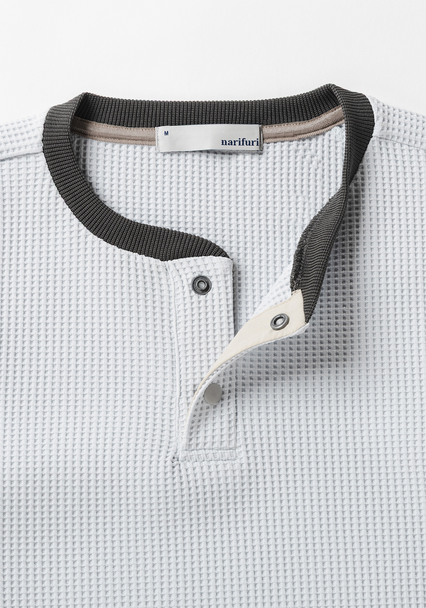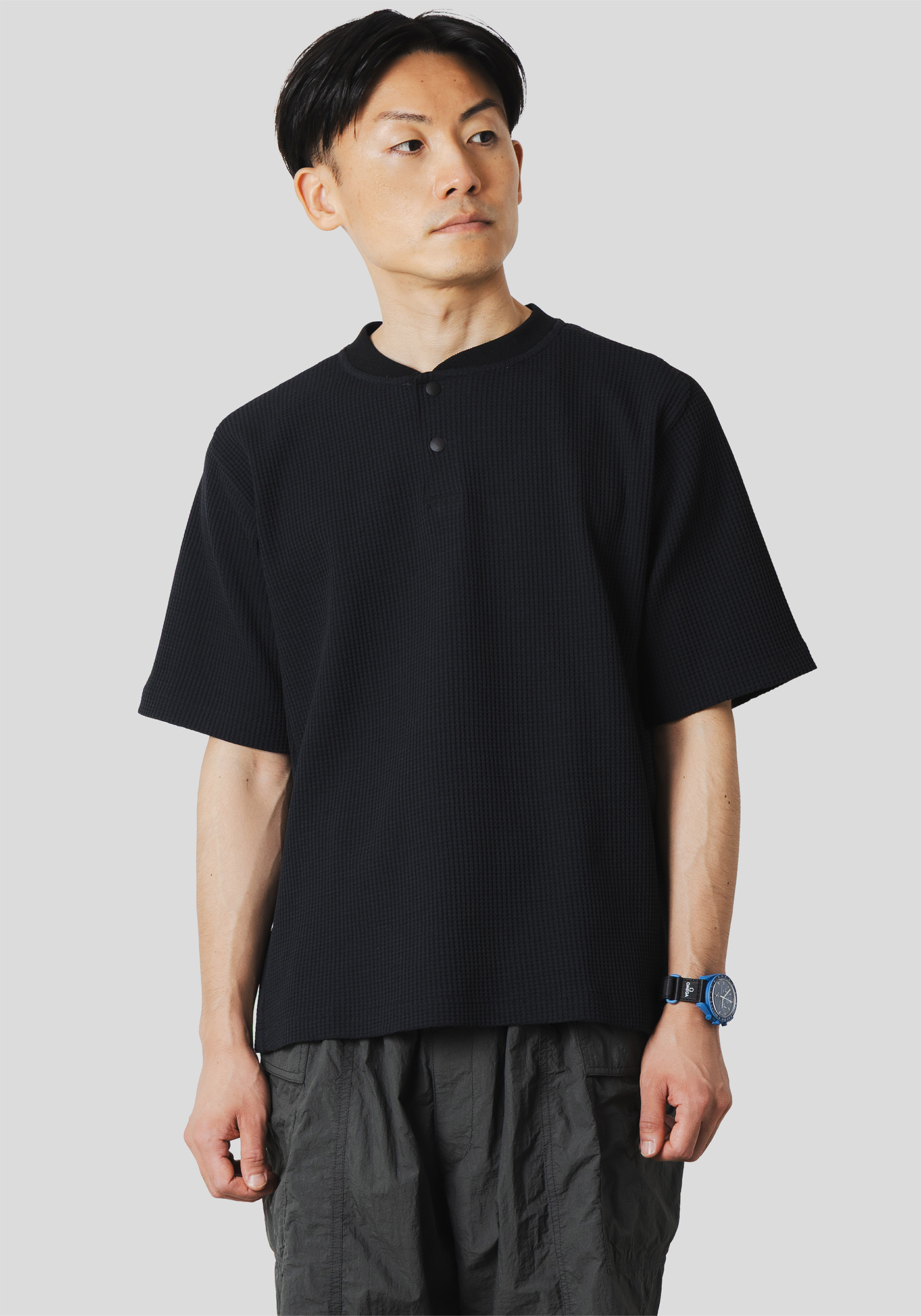 吸汗速乾・UVカットなどの機能を備えたポリエステルワッフル生地を使用したヘンリーネックタイプのTシャツです。