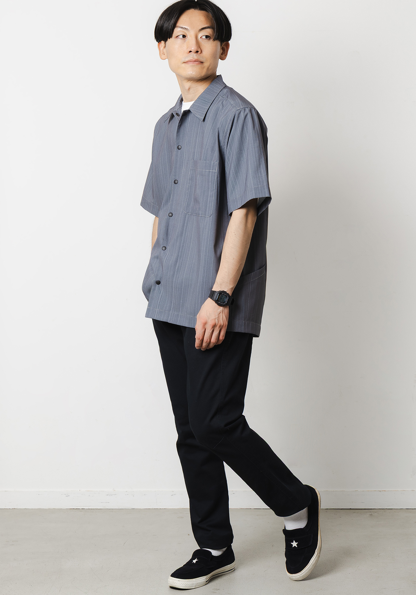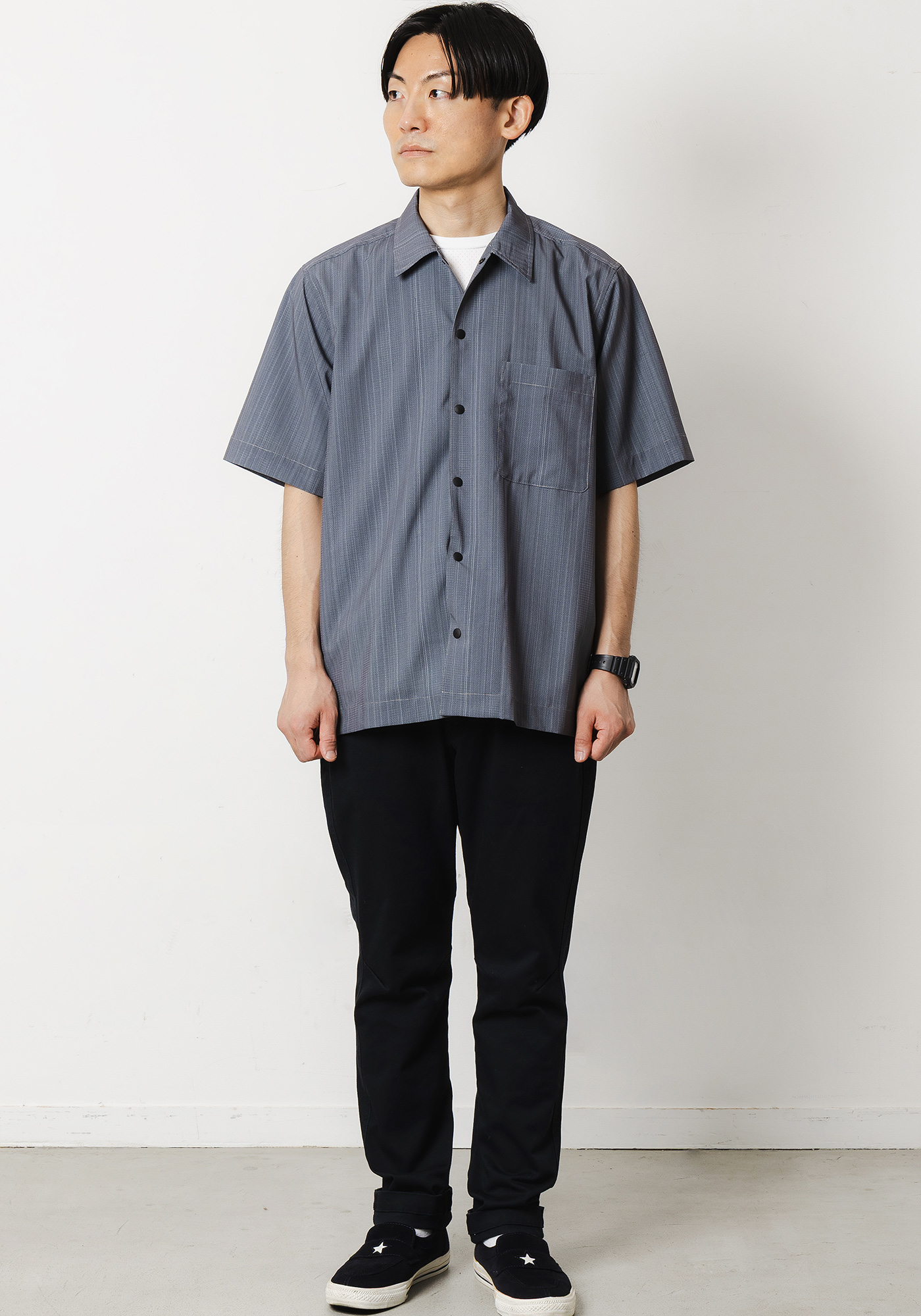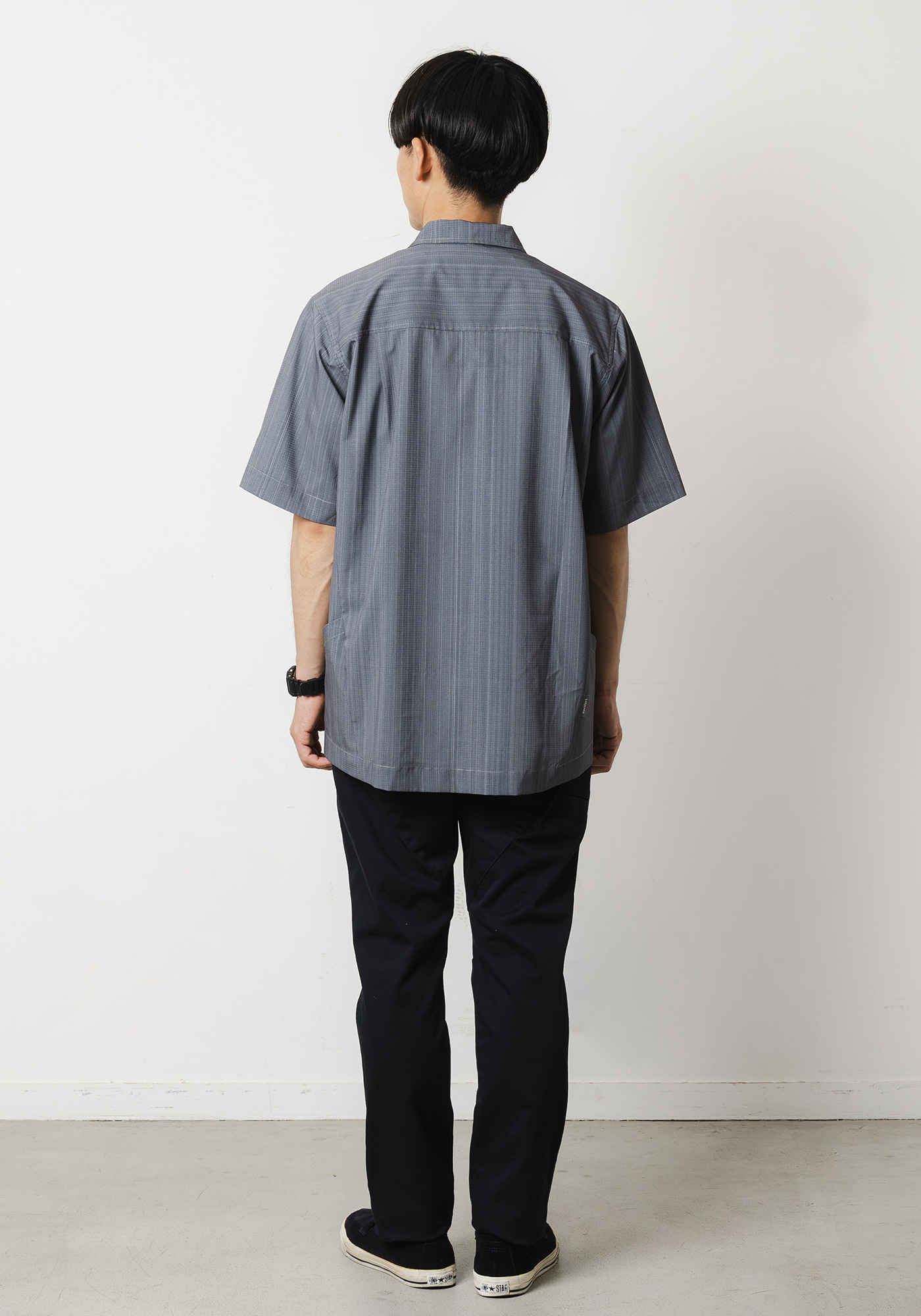 ベーシックなシャツに細腹を付けて小物収納が出来るサイドポケットをつけることで日常にも使いやすいアイテムとなっております。
