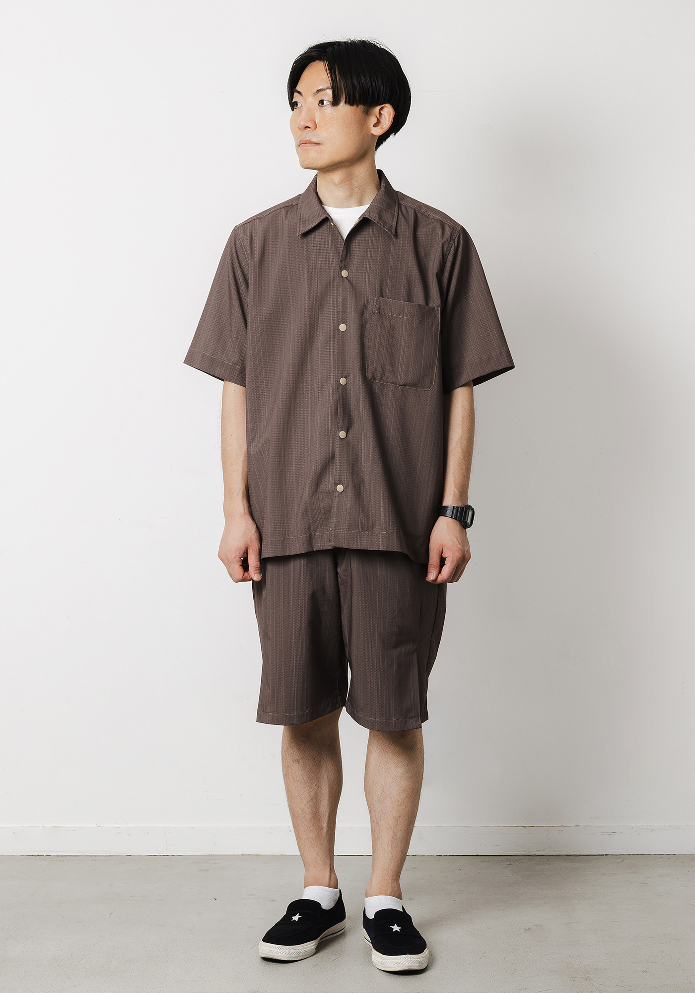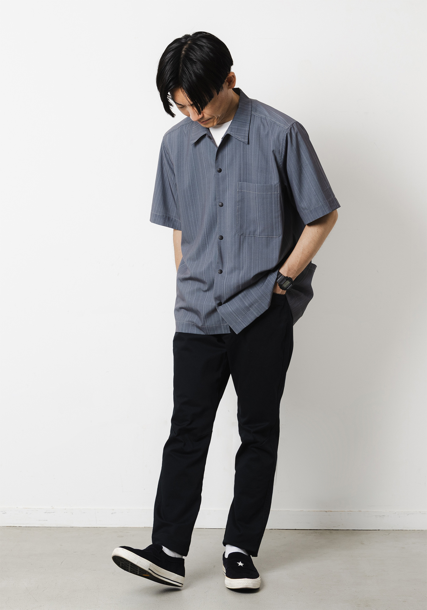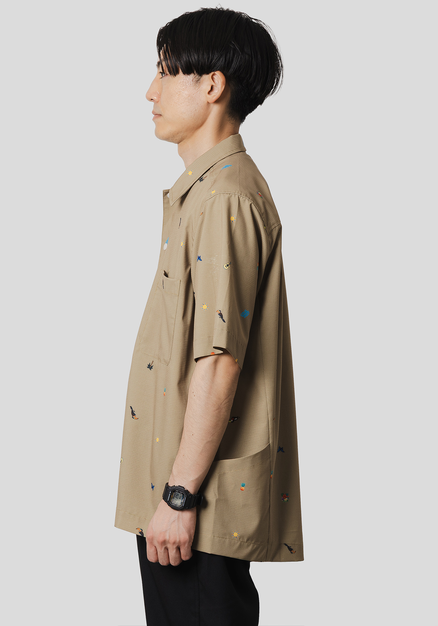 ベーシックなシャツに細腹を付けて小物収納が出来るサイドポケットをつけることで日常にも使いやすいアイテムとなっております。