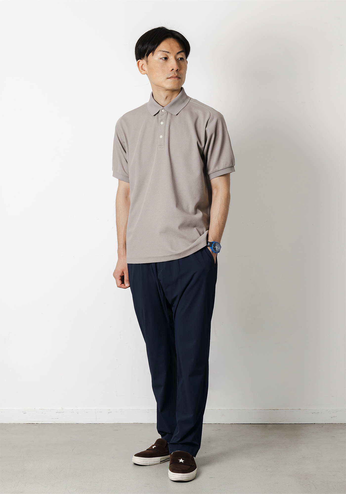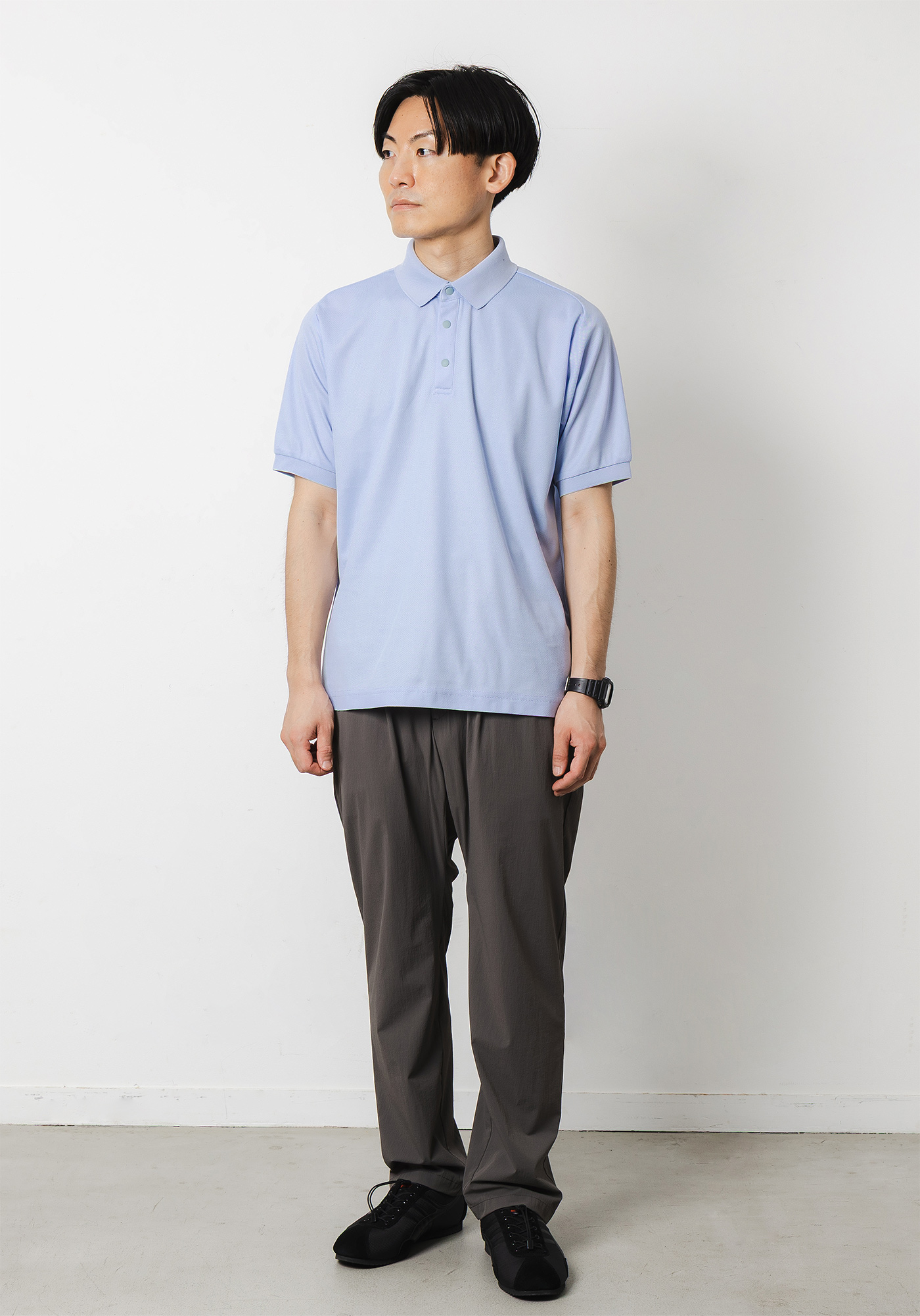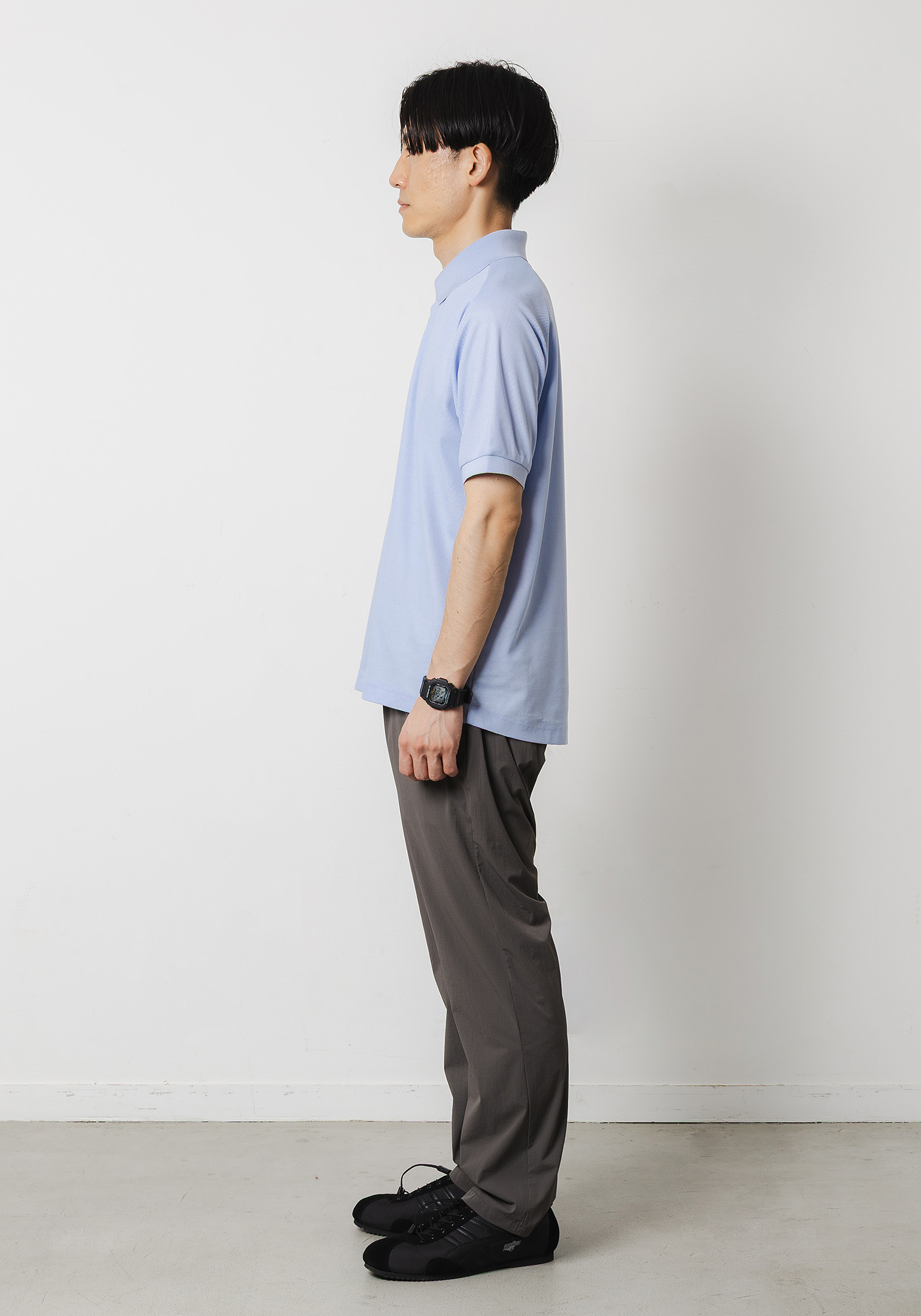着用時は細すぎないやや緩めのシルエットでキレイめな見え方なのでオンオフどちらでも対応可能なスラックスです。