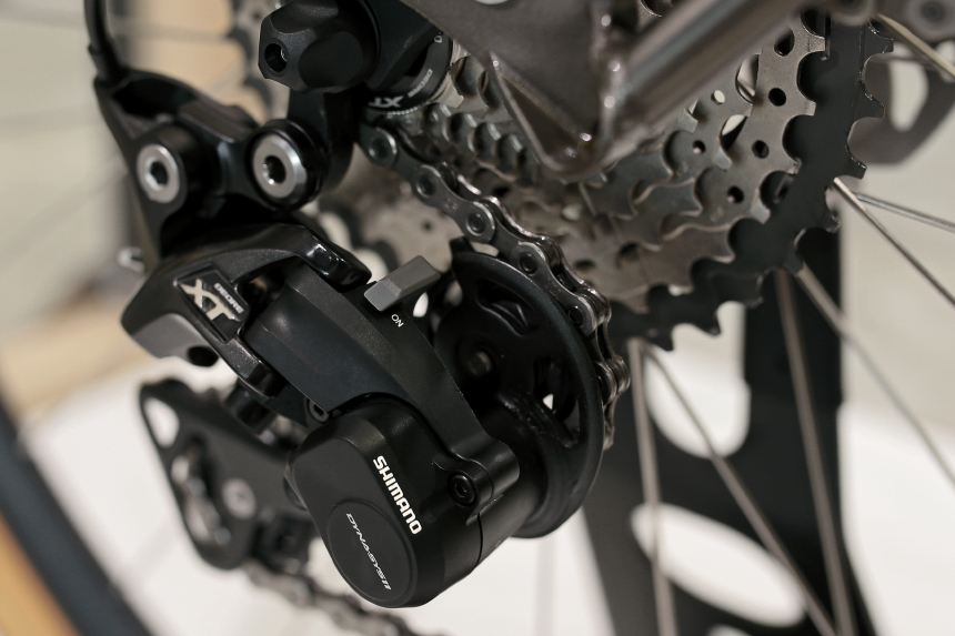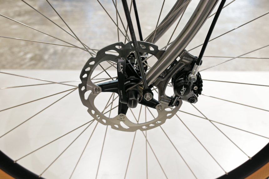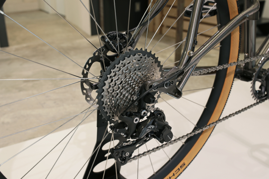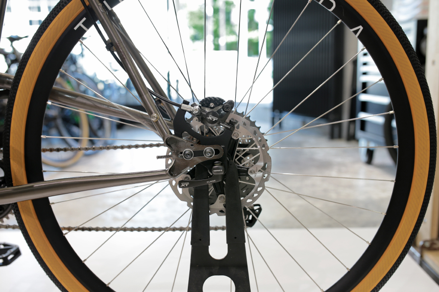 ホイールは手組みで、ハブもXT-M8000。MTBコンポながらリムは700C(H PLUS SON/THE HYDRA 32H/BK)という手組みならではな組み合わせ。このリムはチューブレスレディ対応なので後からチューブレス化も可能です。