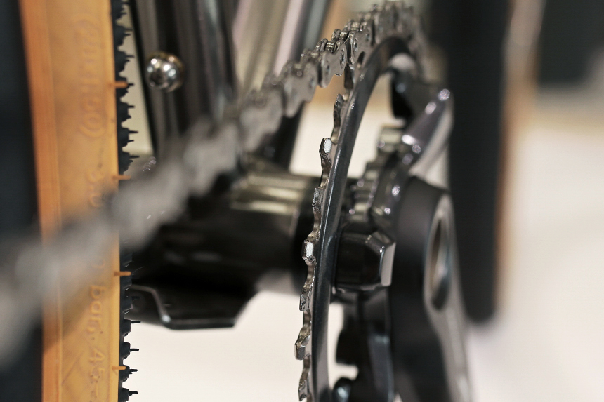 タイヤはオンもオフも快適なSCHWALBE G1 700x38c。このタイヤ値は張りますが見た目も良いですし、走行性能も高くオススメです。