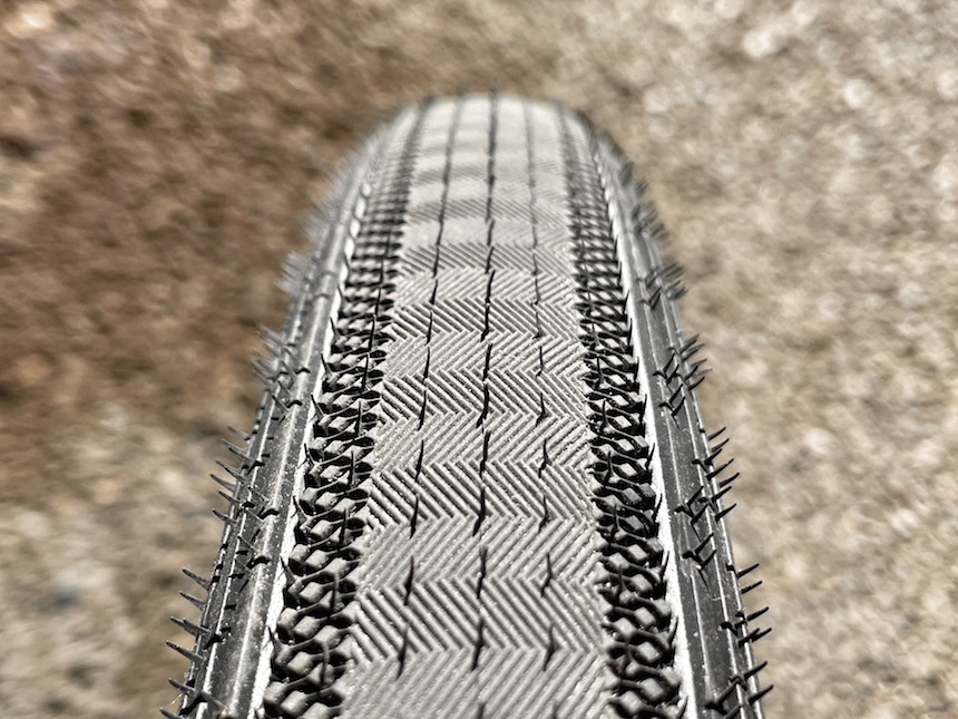 サイドのノブによりカーブでの安定感を備えながらも、舗装路ではセンター部のスリック面で摩擦抵抗を減らすトレッドパターンに加え、43Cという太めのタイヤサイズが街中での使用にピッタリです。
