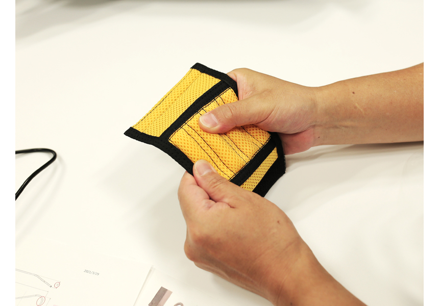 吉原)これは本体の背面にピアノ線のフレームを入れて背中にあたるメッシュとバッグの間に空間を作っていて、この空間を作るためにピアノ線の形状を決めるんですけど。