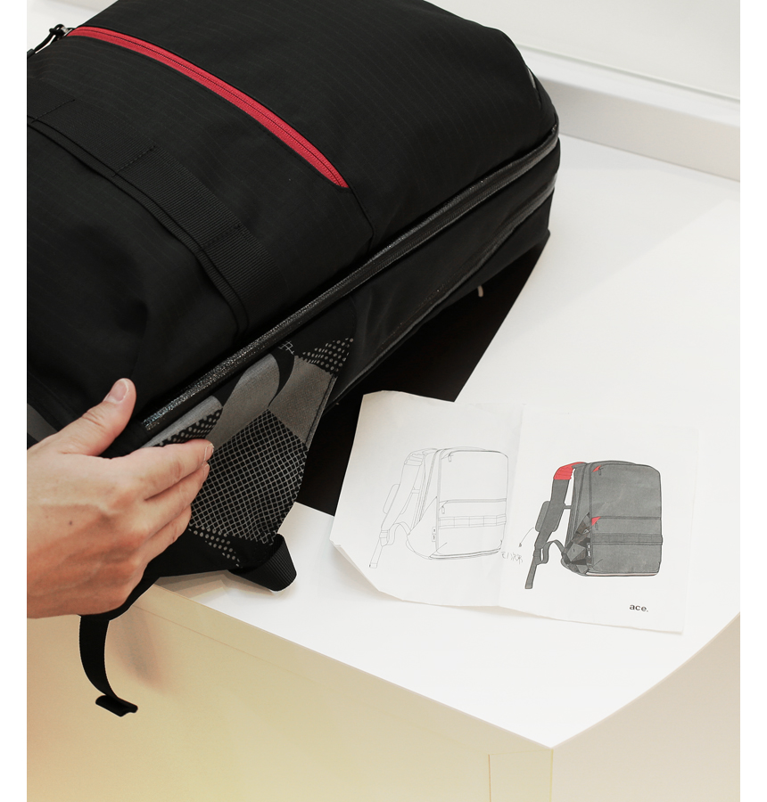 さすがにPCはどんなに小型でも、フレームバッグなどのサブバッグでは持ち運べないし。それにPCはなんだかんだ重量もあるから、背負って運ぶことが理にかなっているなぁと。...で、うちらで何かできないか?とかなり前からデザイナーと話していたんですよねぇ、、、
