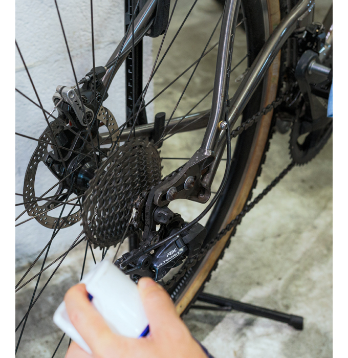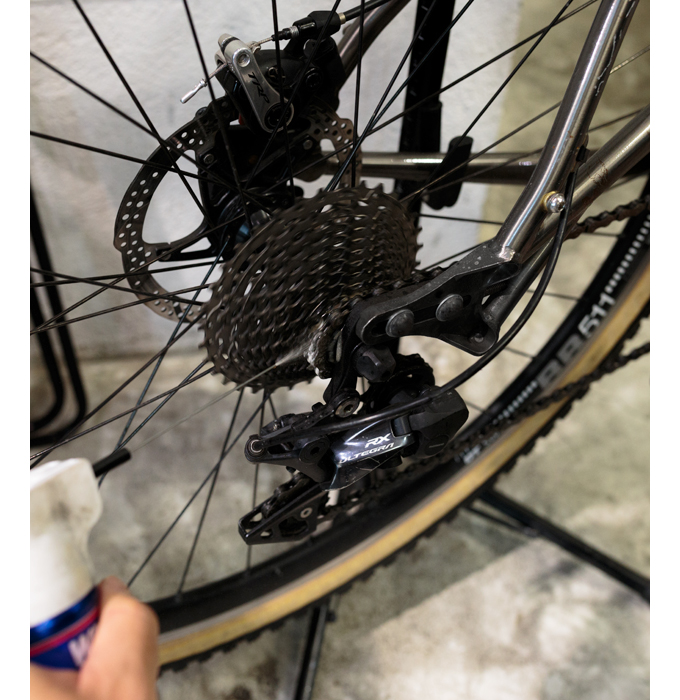 チェーン以外にもブレーキやディレイラーの可動部の隙間を狙って注油してあげるのがおすすめです。こういうところにも水分は当然入り込んでますからね。