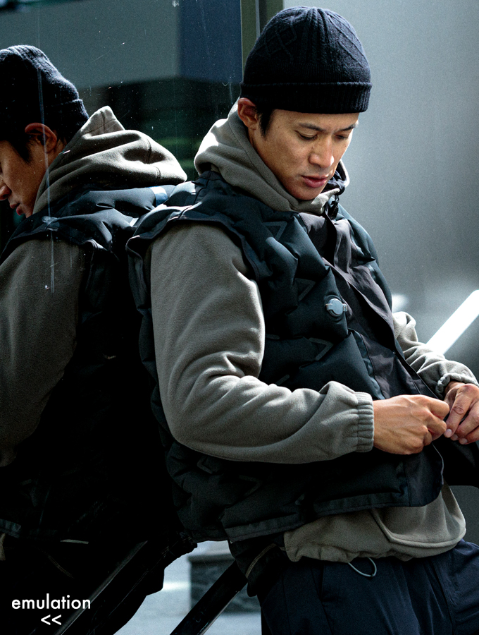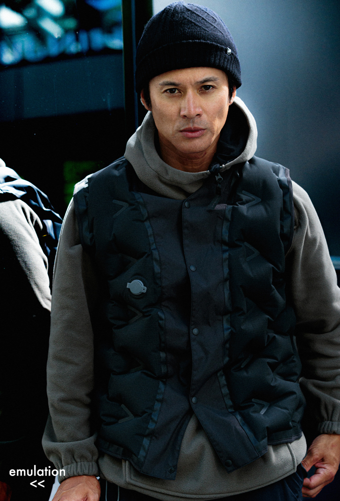 そんな真冬の体温変化をコントロールするため、narifuri×WILD THINGS/モンスターパーカーのライナーに今注目の emulation エアユニットベストを採用しました。